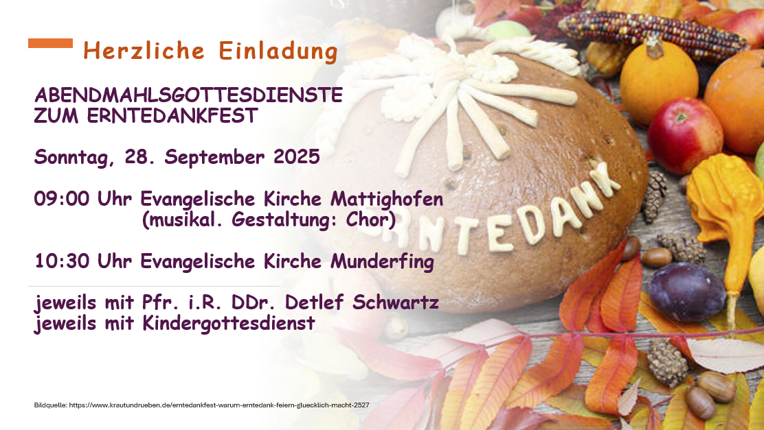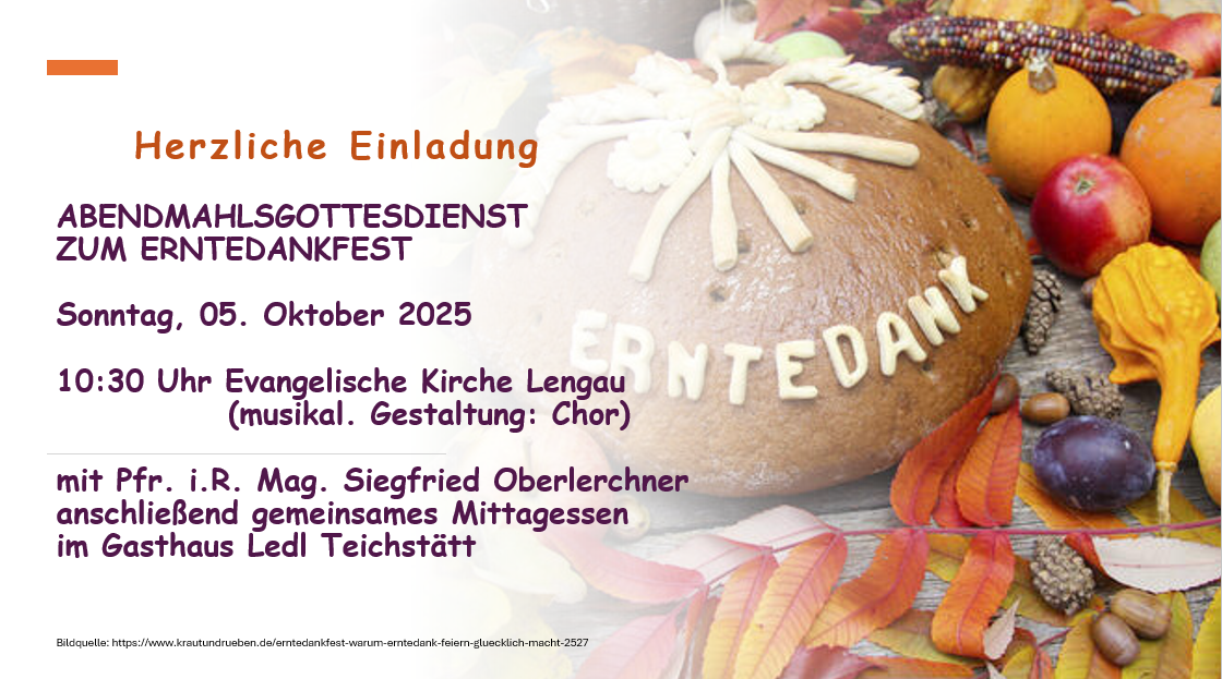 Herzliche Einladung zum Erntedankgottesdienst in der evang. Kirche in Lengau am 05.10.2025 um 10:30 Uhr.